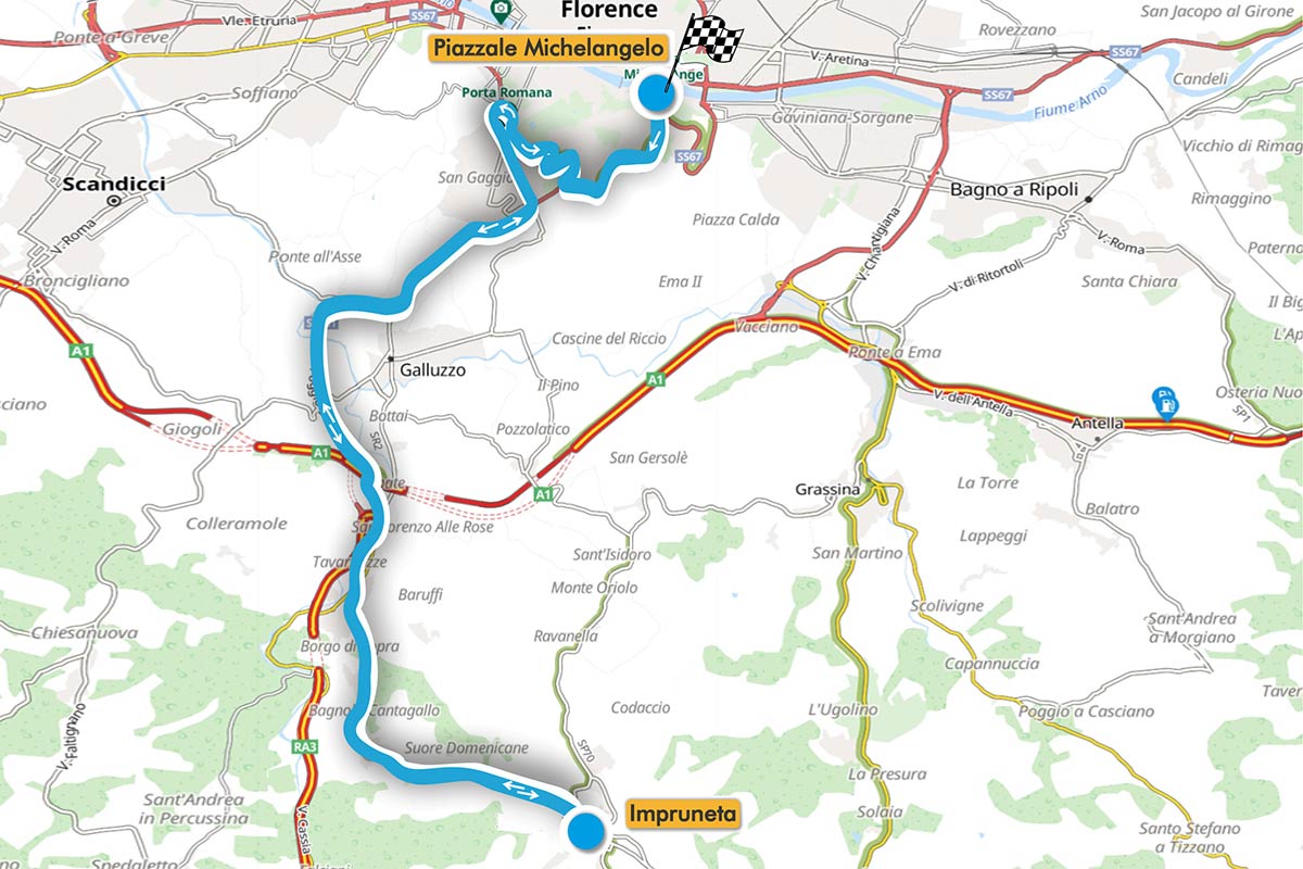 Procediamo lasciandoci sulla sinistra le rampe del Monte alle Croci e la bellissima Basilica di San Miniato al Monte, con la sua eccezionale facciata romanica e affrontiamo con grinta le curve che ci conducono verso la località Galluzzo, con la meravigliosa sua Certosa visibile alla nostra destra. Eccoci infine sulla Strada Imprunetana, dove possiamo far rombare il motore su rettilinei e dolci curve che si alternano in un incantevole paesaggio toscano punteggiato di olivi e cipressi. Arriviamo a Impruneta, la città del cotto, un tipo di terracotta prodotta fin dal Medioevo e scelta da Filippo Brunelleschi per costruire la magnifica Cupola del Duomo di Firenze.